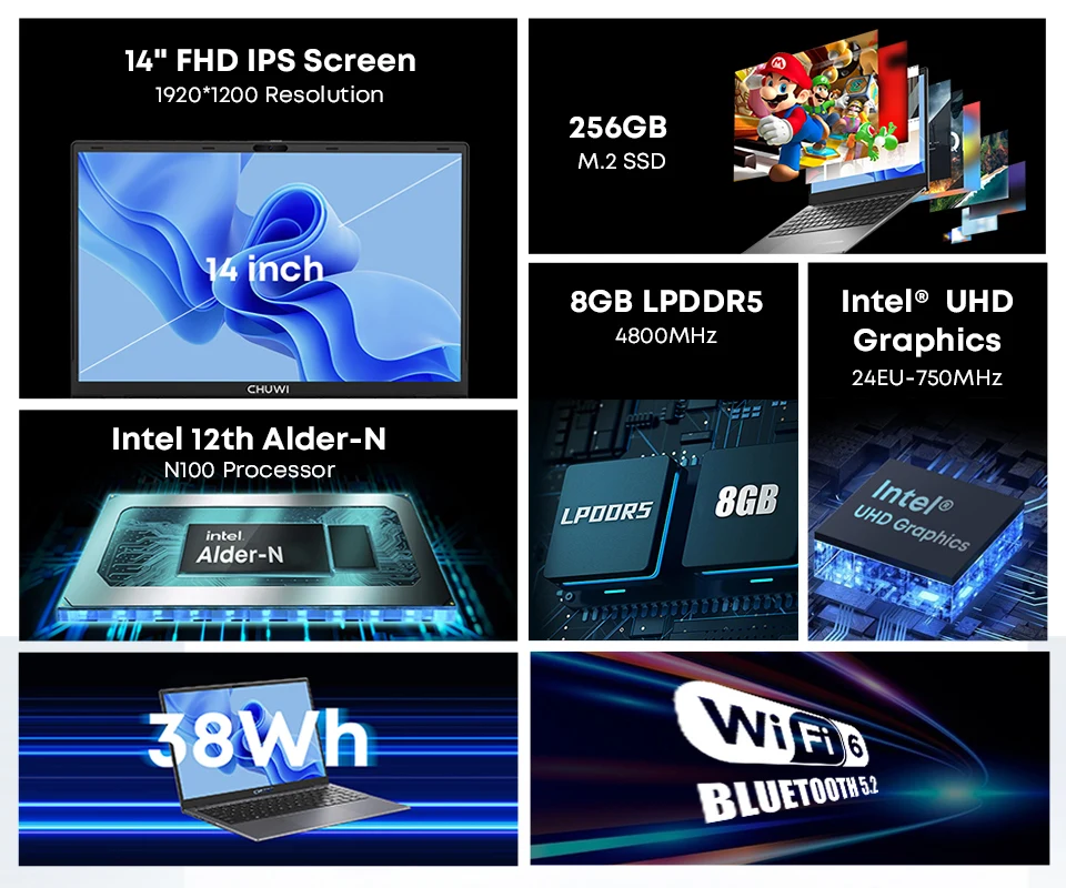 Basic information Brand: CHUWIModel: GemiBook XProOperating System: Pre-installed Windows 11 OSCPU: Intel Celeron N100Core: Quad core, 10nm, 0.8GHz – 3.4GHzGPU: Intel UHD GraphicsBattery: 38Wh, 7.6V/5000mAHMaterial: Plastic(A/ D cover), Plastic (B/ C cover)Color: Gray